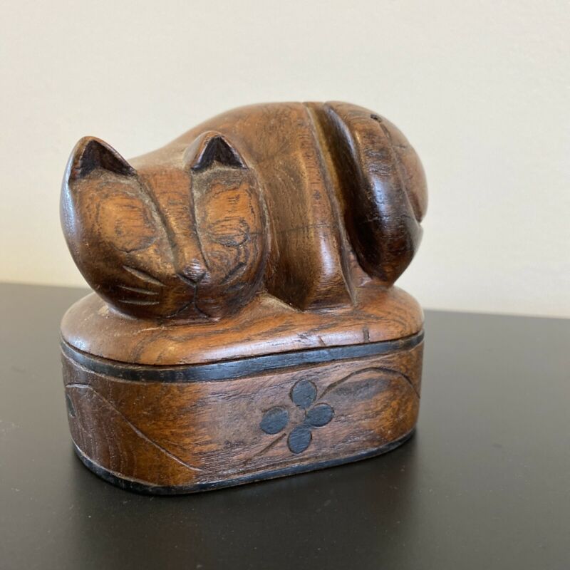 Wooden Handcarved Cat Jewelry Box Small Decorative