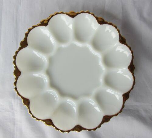 Title (ebay affiliate link): Fire King GOLDEN ANNIVERSARY Deviled Egg Plate, White Milk Glass w/ Gold trim