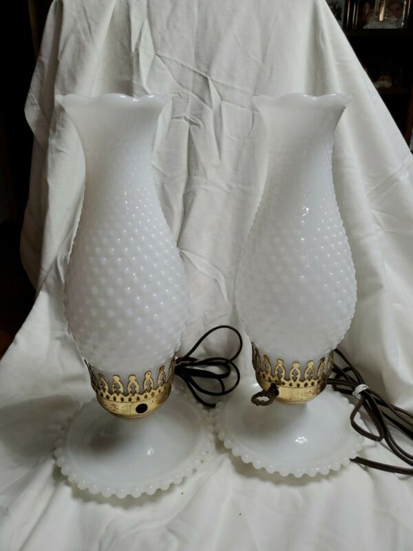 Title (ebay affiliate link): Set ofV VTG White Hobnail Milk Glass Electric Hurricane Lamp Ruffled Chimney
