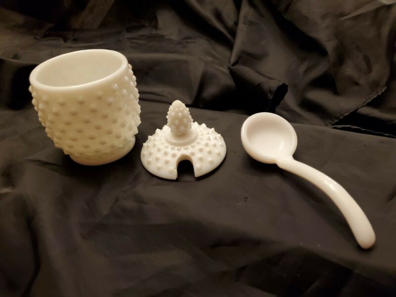 Title (ebay affiliate link): vintage Hobnail milk glass sugar bowl and lid with great harvest ladle!!