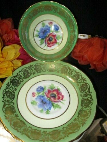 CUP SAUCER PARAGON GOLD LACE EMERALD GREEN HP FLOATING BLUE & RED POPPY