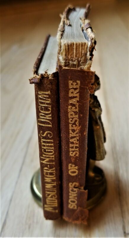 Shakespeare Vintage Leather Miniature book set, Bronze Stand w-Figurine; Unique!