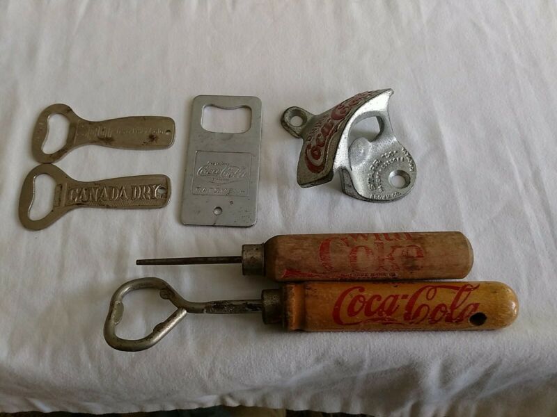 Vntg Lot 6 Bottle Openers Coke Wood Handle Ice Pick Wall Mount Spur Canada Dry