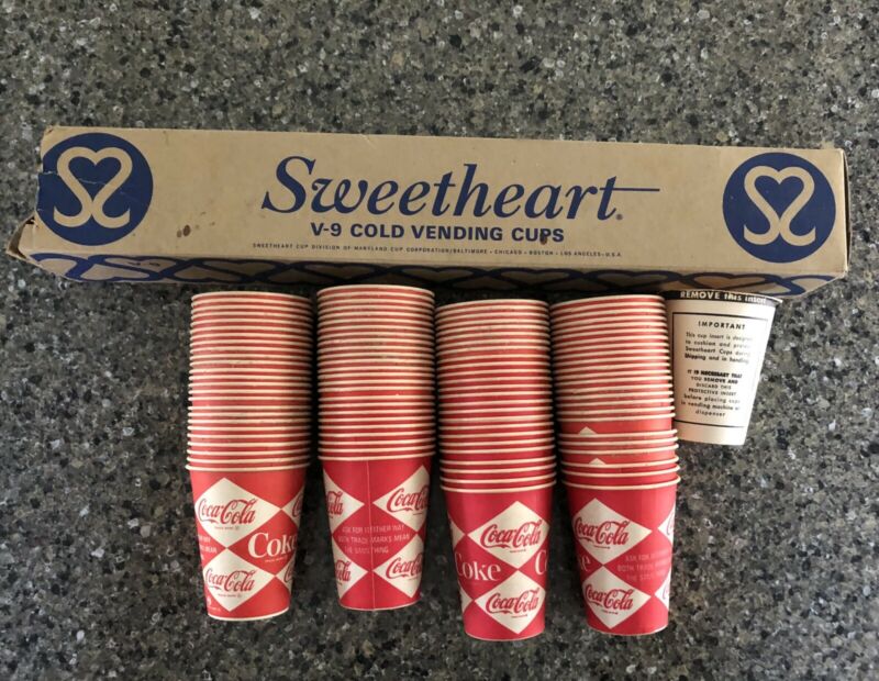Title (ebay affiliate link): NOS Sleeve of 99 Coca Cola Harlequin Vintage Sweetheart V-9 Vending Paper Cups
