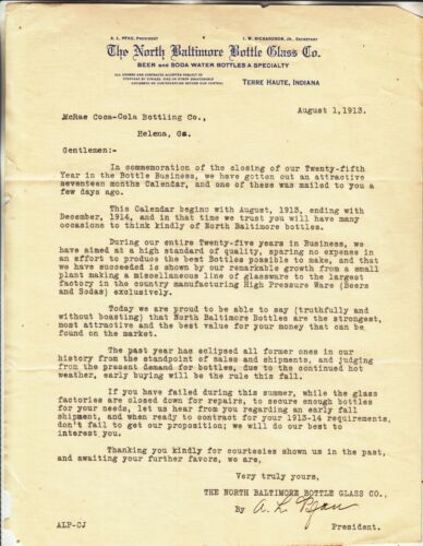 THE NORTH BALTIMORE BOTTLE GLASS CO. LETTERHEAD DATED AUGUST 1., 1913