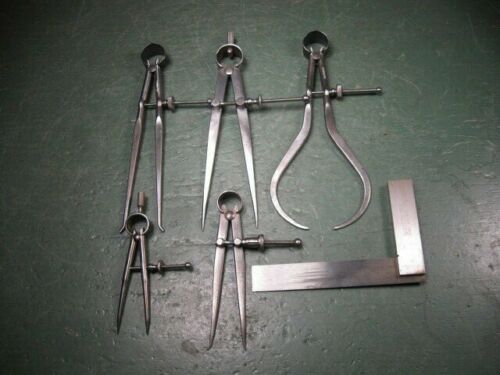 OLD USED VINTAGE MACHINING TOOLS MACHINIST CALIPERS DIVIDERS SQUARE NICE GROUP
