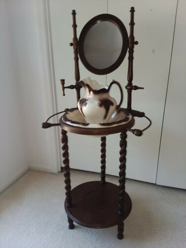 Title (ebay affiliate link): Vintage Wood Wash Stand with Mirror, Candle Holder, Towel Rack, Pitcher and Bowl