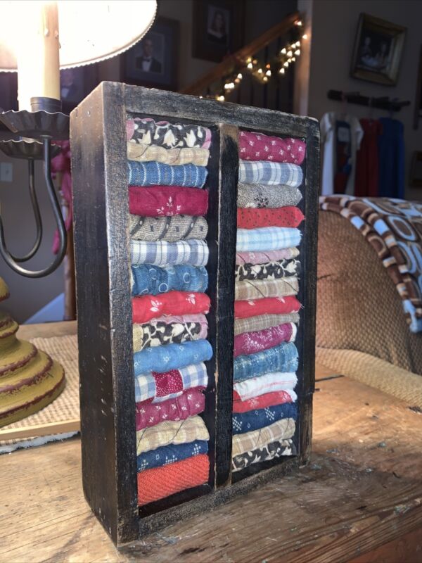 Title (ebay affiliate link): Old Black Wooden Box W/ Divider Filled W/ Early Quilt Scrapes Calico & Wool