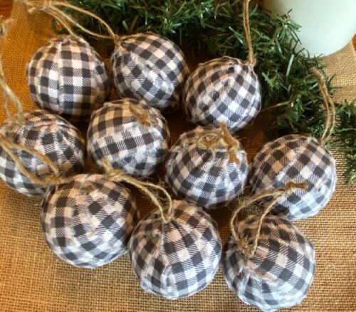 Title (ebay affiliate link): 10 Primitive Gray Buffalo plaid Fabric RAG BALLS Christmas Ornaments A4