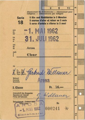 Title (ebay affiliate link): Railway tickets Switzerland RhatischeBahn Arosa Chur three month abonnement 1962