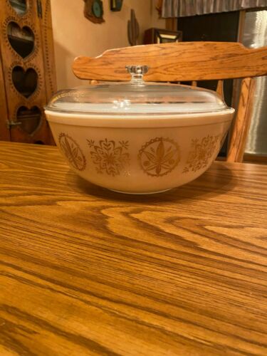 Title (ebay affiliate link): Vtg Pyrex 404 HEX SIGNS 4 qt Promotional Mixing Bowl Lid Tan Gold MCM 58