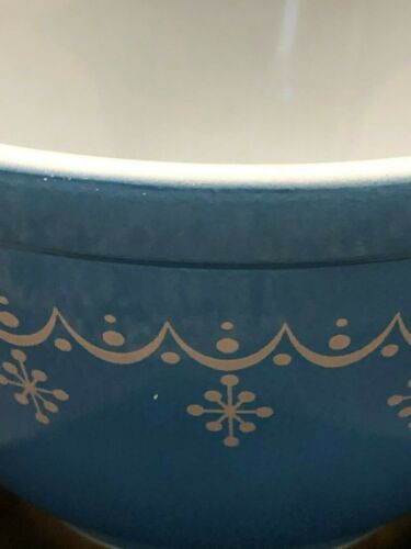 Title (ebay affiliate link): Pyrex 1 1/2 pt Vintage Nesting Mixing Bowl Blue & White GARLAND SNOWFLAKE
