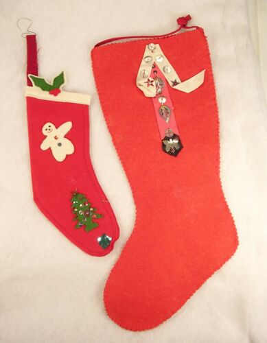 2 Vintage Christmas FELT STOCKING with Sequence Buttons & Xmas Tree 1920''s-1930s