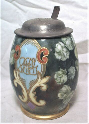 1800s BELLEEK SIGNED HAND PAINTED HOP BUDS LIDDED BEER STEIN W/ SILVERPLATE LID