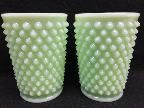 pair of Jadeite Hobnail pattern glass tumblers cups goblets jade Green Milk set