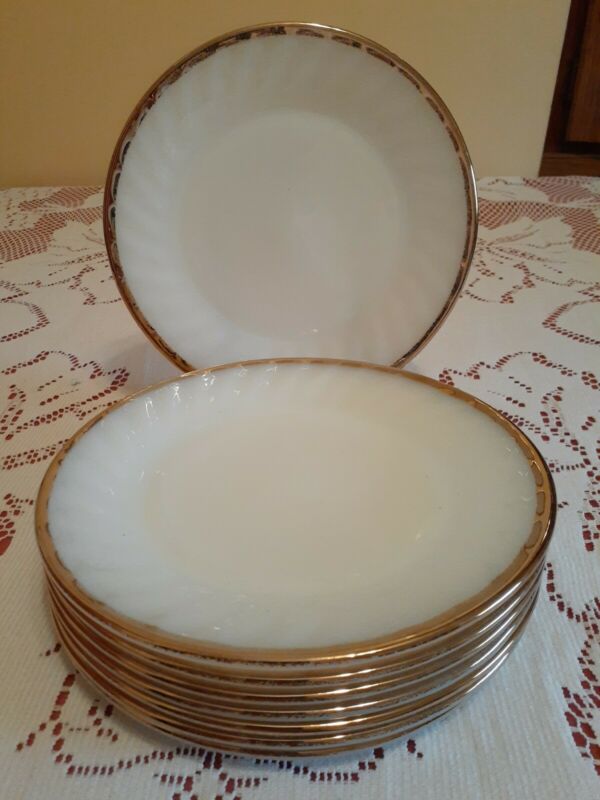Title (ebay affiliate link): 8 Vintage Fire King Ware White Milk Glass Swirl with Gold Trim 7.5" PLATES EUC