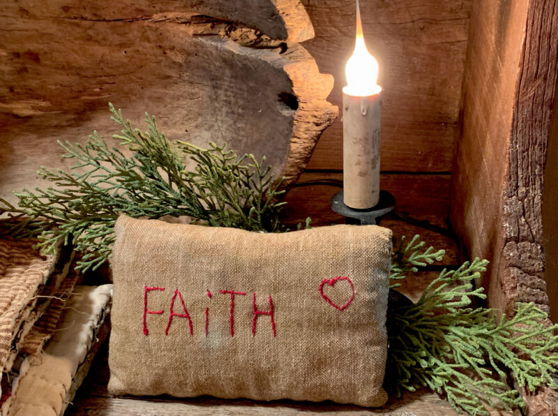 Title (ebay affiliate link): Faith Pillow Early Brown Lindsey Woolsey W/ Stitched Red Heart Christmas Time