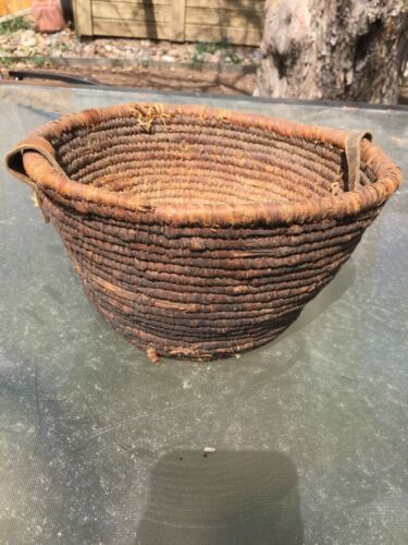 Title (ebay affiliate link): Antique Coiled Reed Woven Basket-Rawhide Carrying Strap