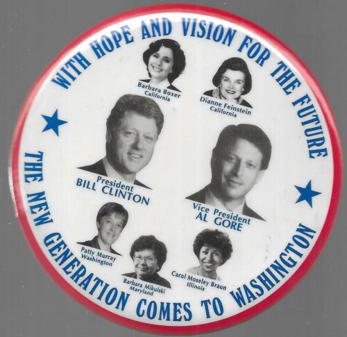 Title (ebay affiliate link): CLINTON, GORE HOPE, VISION WOMEN CANDIDATES BOXER, FEINSTEIN 1992 POLITICAL PIN