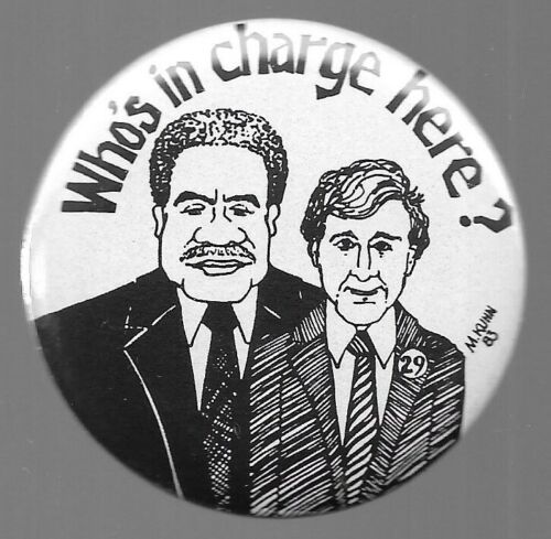 Title (ebay affiliate link): HAROLD WASHINGTON WHO''S IN CHARGE HERE CHICAGO CARTOON POLITICAL PIN