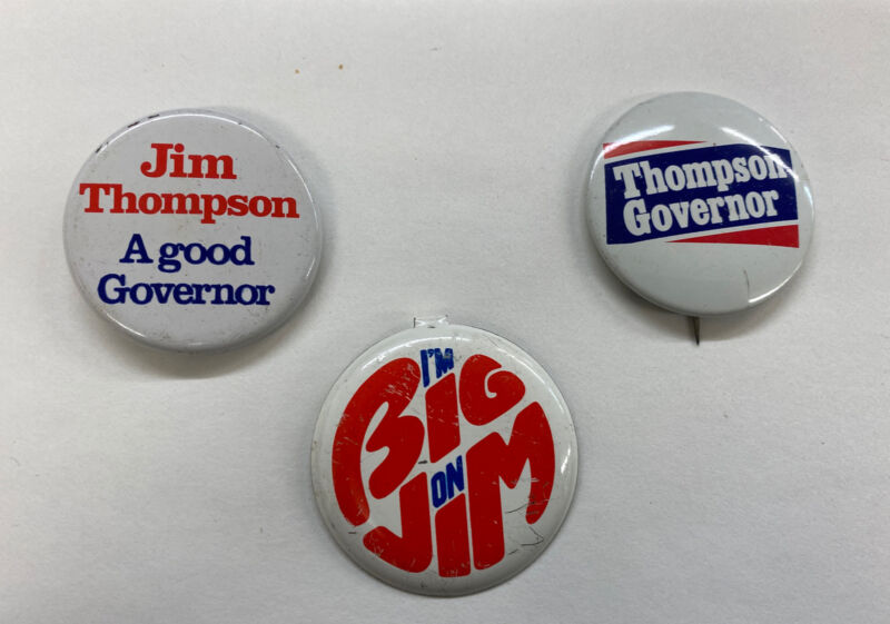 Title (ebay affiliate link): 3 Big Jim Thompson Illinois Governor 1977-1991 Original Political Pins