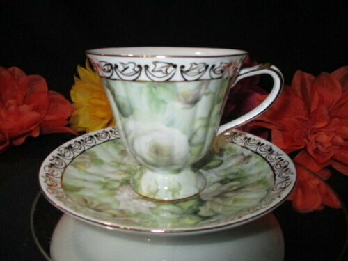 CUP SAUCER ELEGANT ANTIQUE ROSE BY SKYE McGHIE WHITE ROSES MINT GREEN CHINTZ