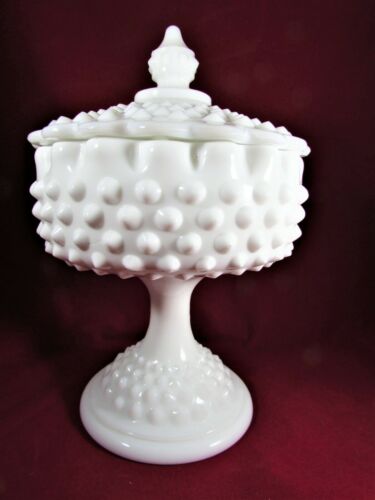Title (ebay affiliate link): VINTAGE SIGNED FENTON MILK GLASS HOBNAIL 8 1/4" COVERED CANDY JAR