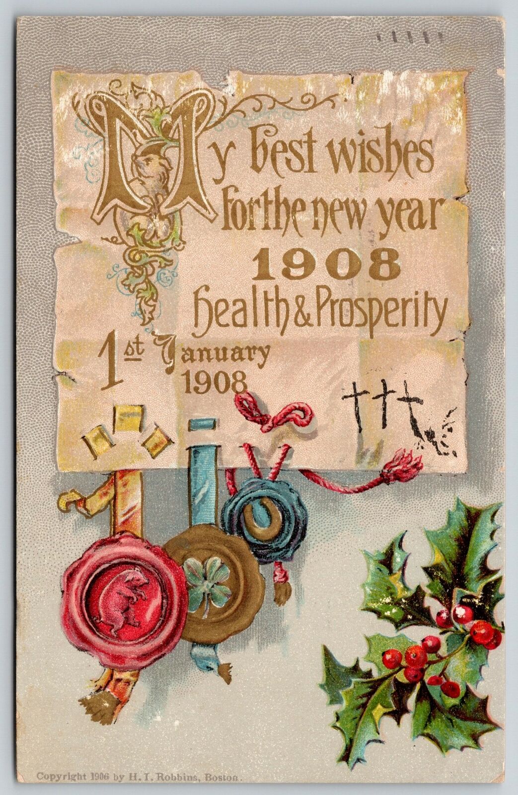 New Year Calligraphy~1908 Number on Parchment~Seals: Pig Clover Horseshoe~HIR