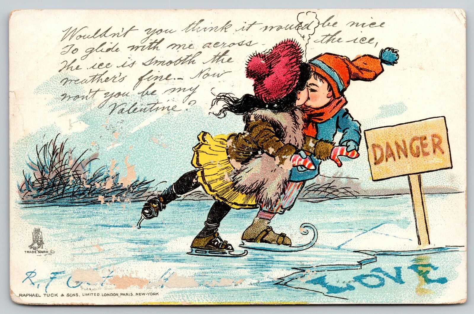 Title (ebay affiliate link): RF Outcault Valentine~Couple Ice Skate Toward Danger Sign: LOVE Crack~TUCK 1907