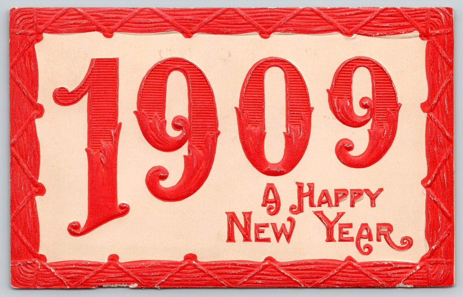 New Year~Large Ornate Number 1909~Red on Tan~Red Border Embossed~Postcard