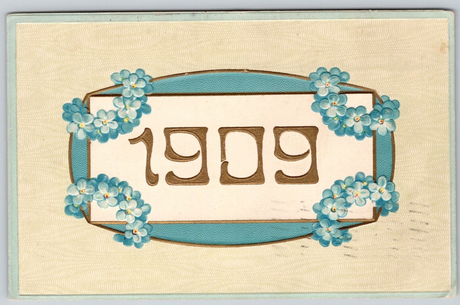 New Year~Gold Large Number 1909 in Blue Forget-Me-Nots Design~Embossed~Germany
