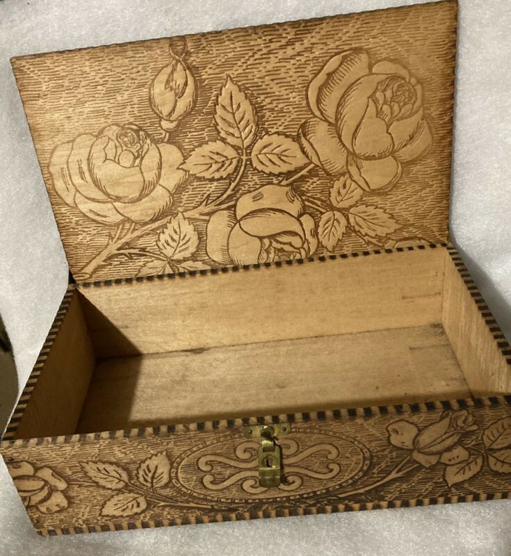 Title (ebay affiliate link): Antique Pyrography Wood Box ROSES Metal Hinges Turnkey Lock 9" x 5.5" x 2.5" EUC
