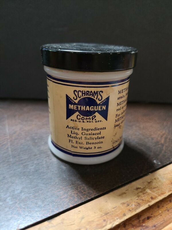 Title (ebay affiliate link): Vntg Milkglass Schrams Methaguen Jar & Contents Oak Park Ill.