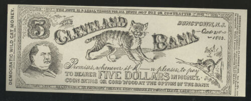 Title (ebay affiliate link): 1892 DEMOCRAT WILD CAT MONEY, $5 BILL, THE CLEVELAND BANK, BUNGTOWN, N.J.