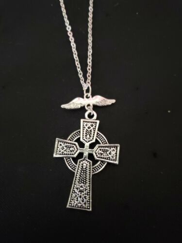 Title (ebay affiliate link): Antique Silver Tone Wings Celtic Cross #2 necklace Stainless Steel