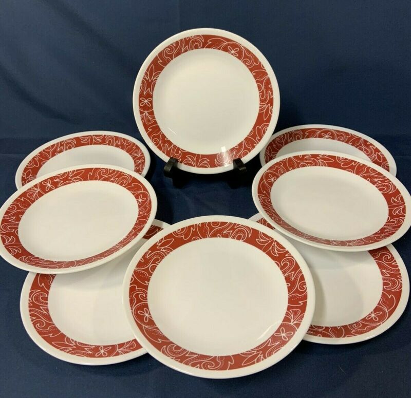 Vintage Corelle BANDHANI Set of 8 Bread Plates 6-3/4" White w/Red Bandana band