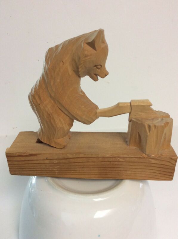 Vintage Articulate Russian Wood Hand Carved Bear Chopping wood Action Toy