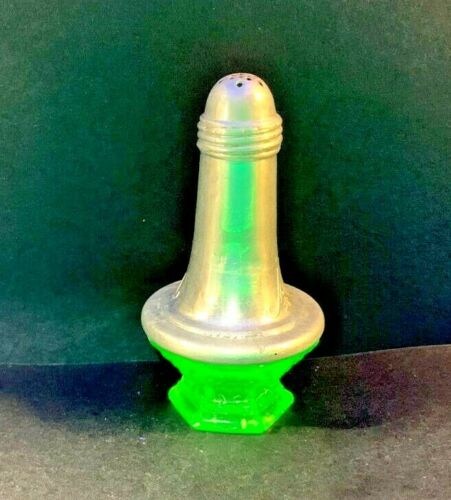 Vintage Silver Plated Green Uranium Depression Glass Salt Shaker