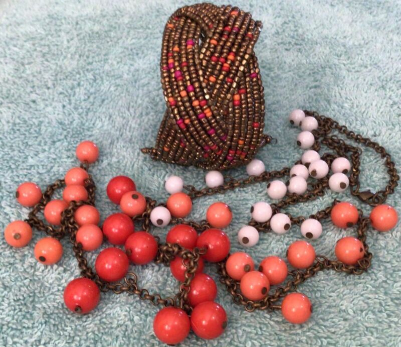 Multi colored ball beaded long Necklace Bracelet set lot Antique Gold Dangle