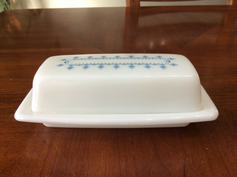 Title (ebay affiliate link): Vintage PYREX Blue Snowflake Garland Butter Dish w/ Cover - Made in USA