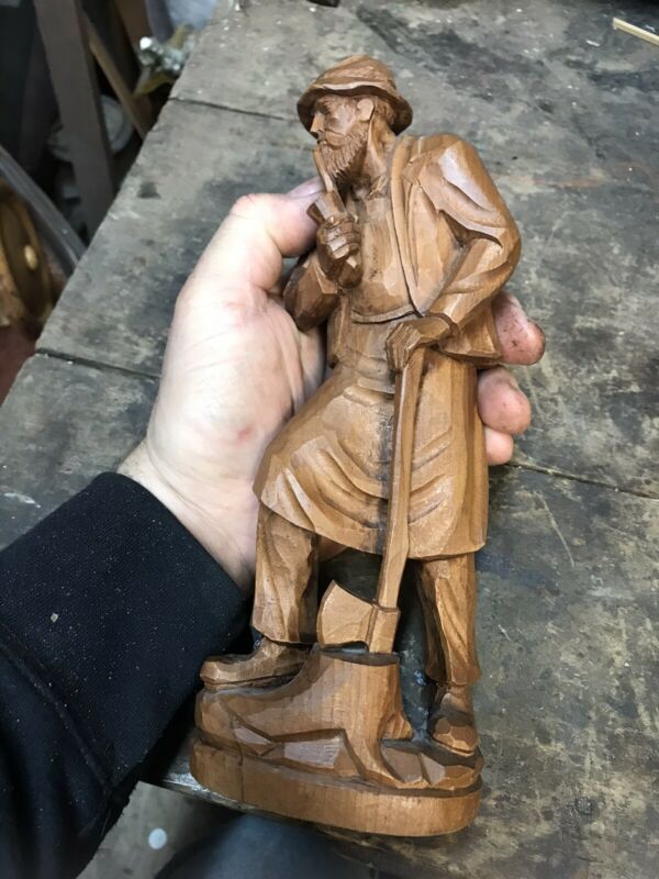 Title (ebay affiliate link): Black Forest Swiss wood carving sculpture Lumberjack Axe Wood Chopping Pipe Man