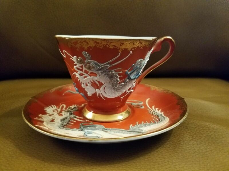 Title (ebay affiliate link): Castle Japan Moriage Dragon Tea Cup and Saucer, Bone China Red with Gold Trim