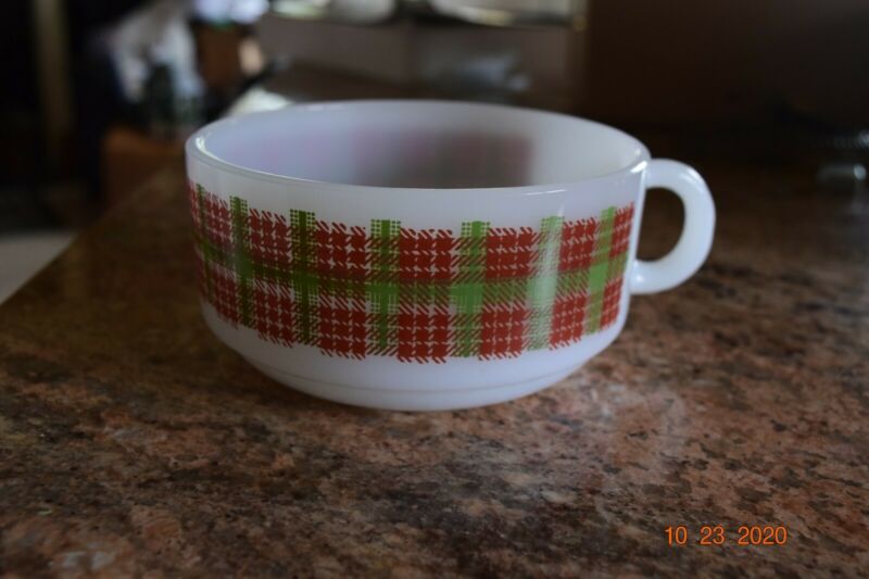 Title (ebay affiliate link): Vintage Glasbake Scottish green and red plaid soup bowl with "D" handle