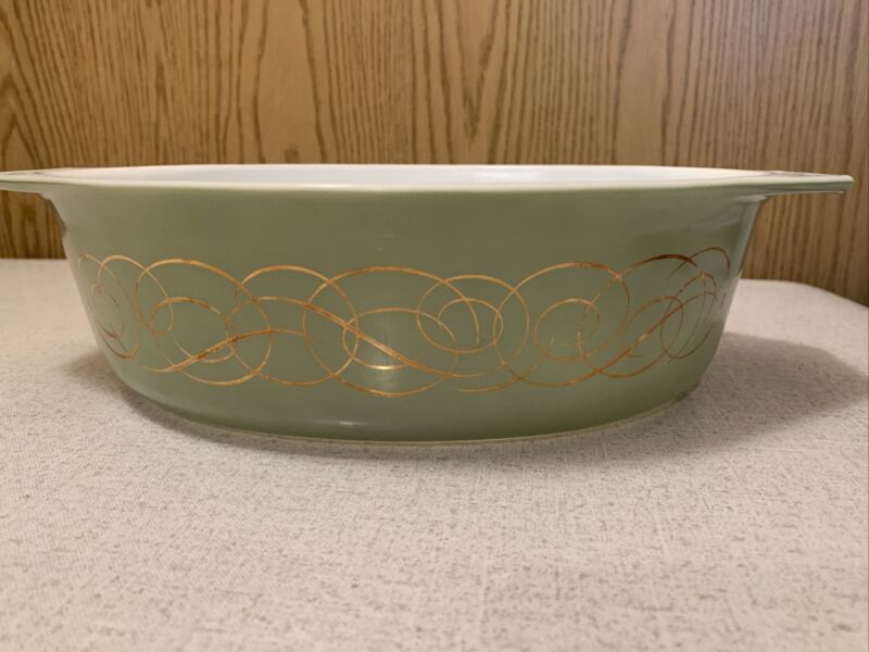 Title (ebay affiliate link): Vintage Pyrex Sage Green Golden Scroll 2 1/2 qt. Oval Casserole Dish