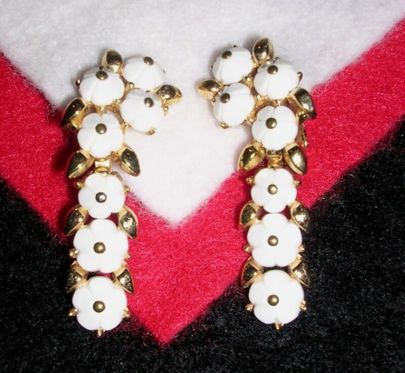 135D Vintage Signed TRIFARI White MILK GLASS Tiny Flowers DANGLING Clip Earrings
