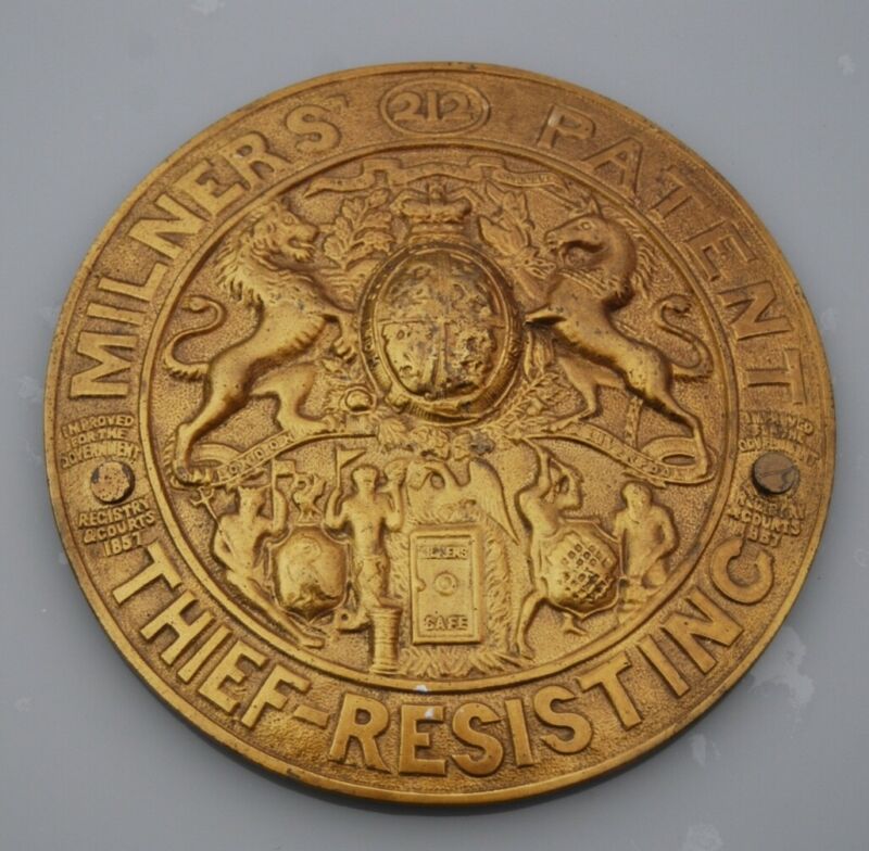 Title (ebay affiliate link): Brass Milners Patent Thief Resisting safe plate 20cm diameter