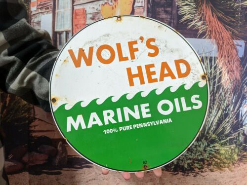 Title (ebay affiliate link): VINTAGE DATED 1962 WOLF''S HEAD MARINE MOTOR OIL PORCELAIN ENAMEL GAS PUMP SIGN