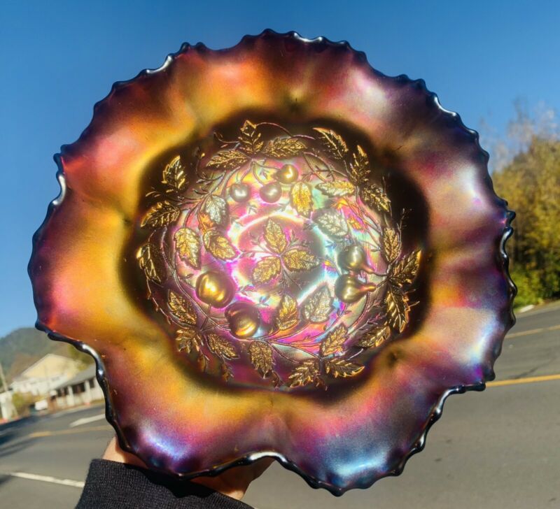 Title (ebay affiliate link): Antique NORTHWOOD Three Fruits Medallion Electric Amethyst Carnival glass Bowl