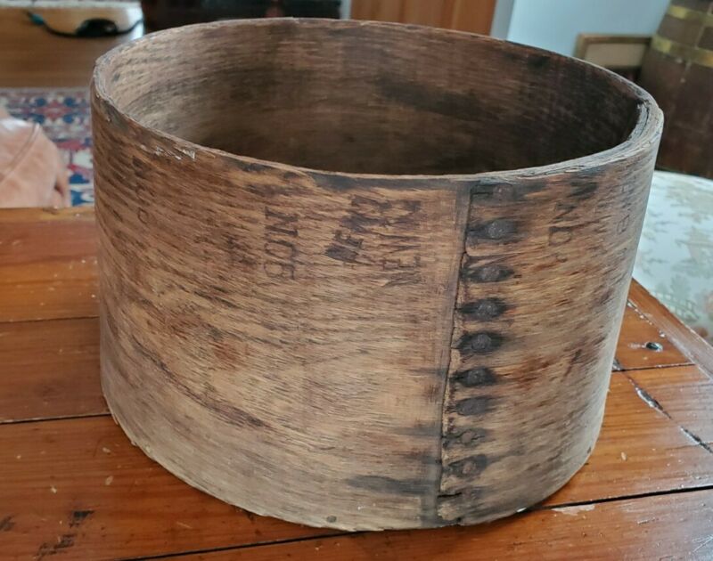Title (ebay affiliate link): ANTIQUE 19TH C WOOD ROUND GRAIN MEASURE BOX CONTAINER 9" wide