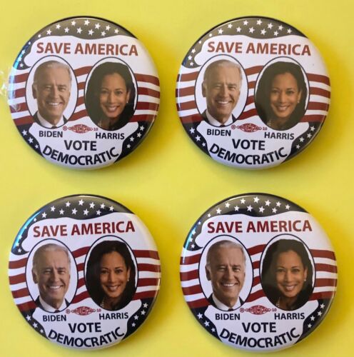 Title (ebay affiliate link): Lot of Four 2 1/4" Biden-Harris Save American Vote Democratic Pinback Buttons